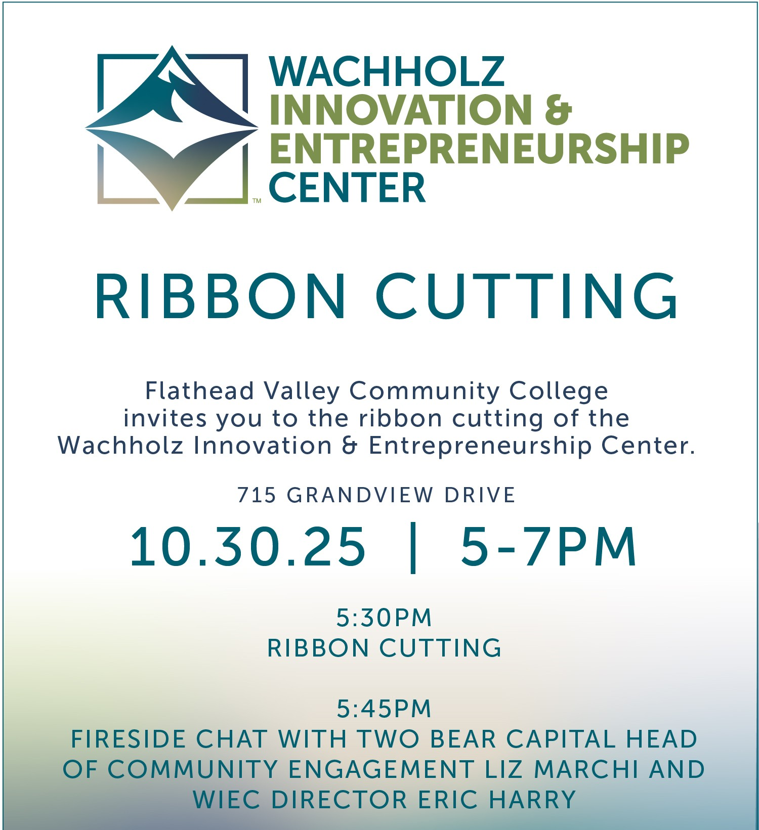 Join Flathead Valley Community College for the ribbon cutting of the Wachholz Innovation and Entrepreneurship Center (WIEC). Following the ribbon cutting will be a fireside chat featuring Liz Marchi, Head of Community Engagement for Two Bear Capital, and Eric Harry, Director of the WIEC.